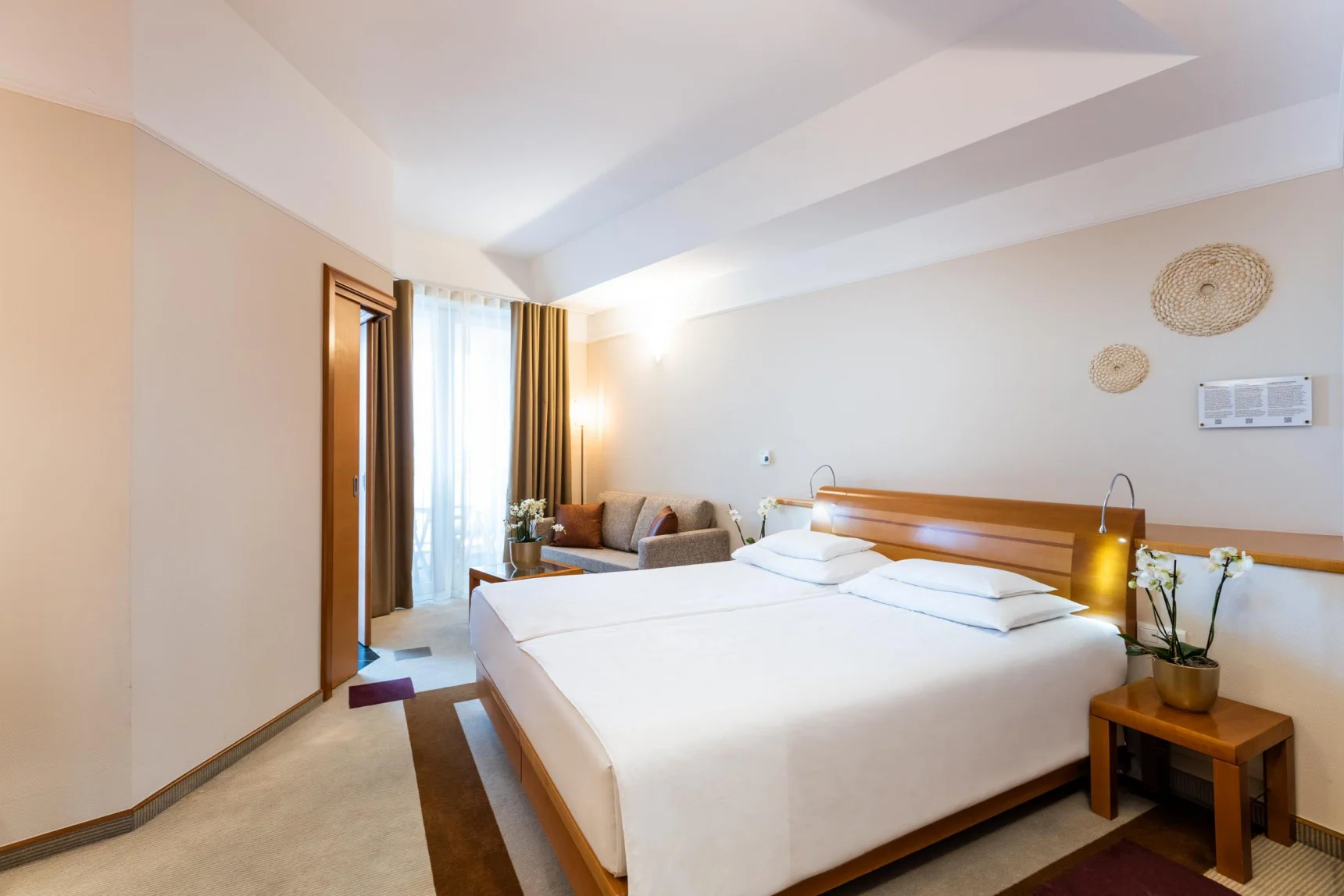 Elegantna in udobna dvoposteljna soba z ležiščem širine 180 cm ali ločenima ležiščema širine 90 cm in balkonom. V sobi (33 m2) je pisalna miza, sofa ter kopalnica s kadjo s termalno in običajno vodo in WC-jem.