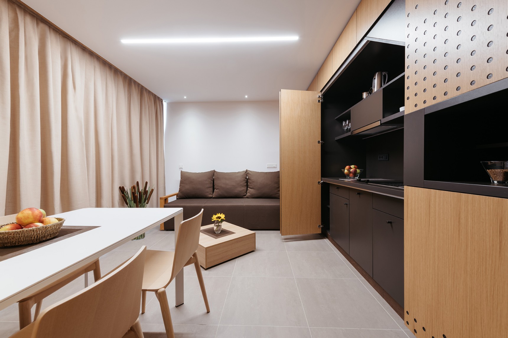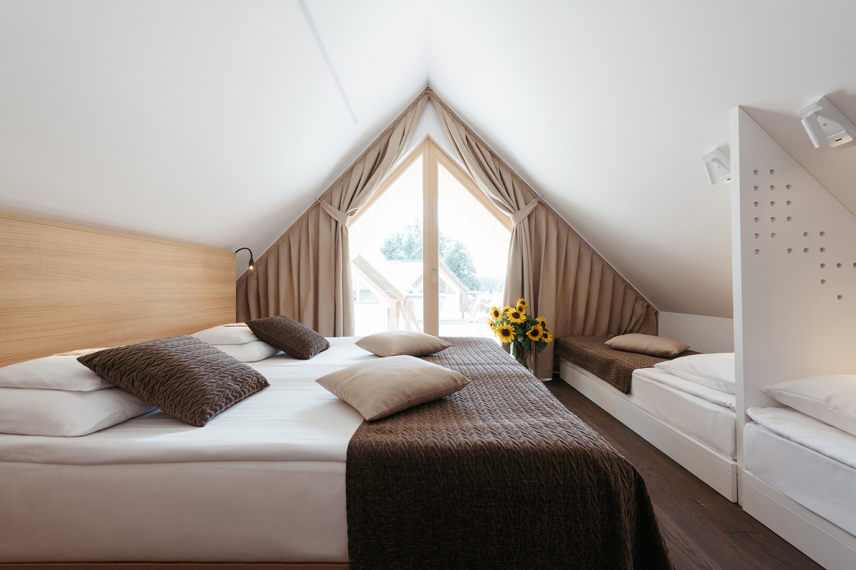 Hišica za štiri osebe (38,3 m2) z enim ležiščem širine 180 cm in dvema ležiščema 90 cm v zgornjem nadstropju ter raztegljivim trosedom dimenzij 160 x 200 cm v pritličju. V hišici je kopalnica s tušem in WC-jem, jedilna miza, raztegljiv trosed in kuhinja s kuhalno ploščo, hladilnikom, pomivalnim koritom, pomivalnim strojem in kompletom posode za 4 osebe. Pred hiško je tudi urejena terasa.