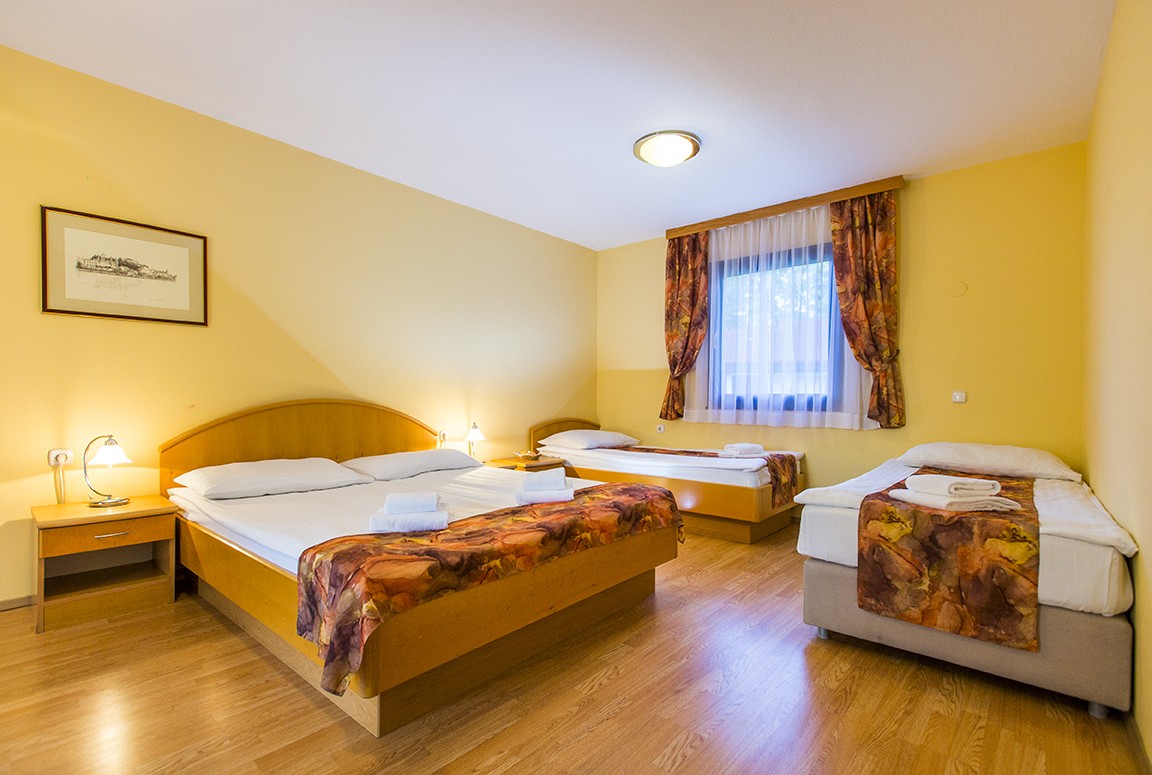 Udoben bungalov za pet oseb z ležišči širine 180 cm ali ločenimi ležišči širine 90 cm in pogledom na park. V bungalovu velikem 40 m2 je kopalnica s tušem in WC-jem, terasa, pisalna miza in kavč.