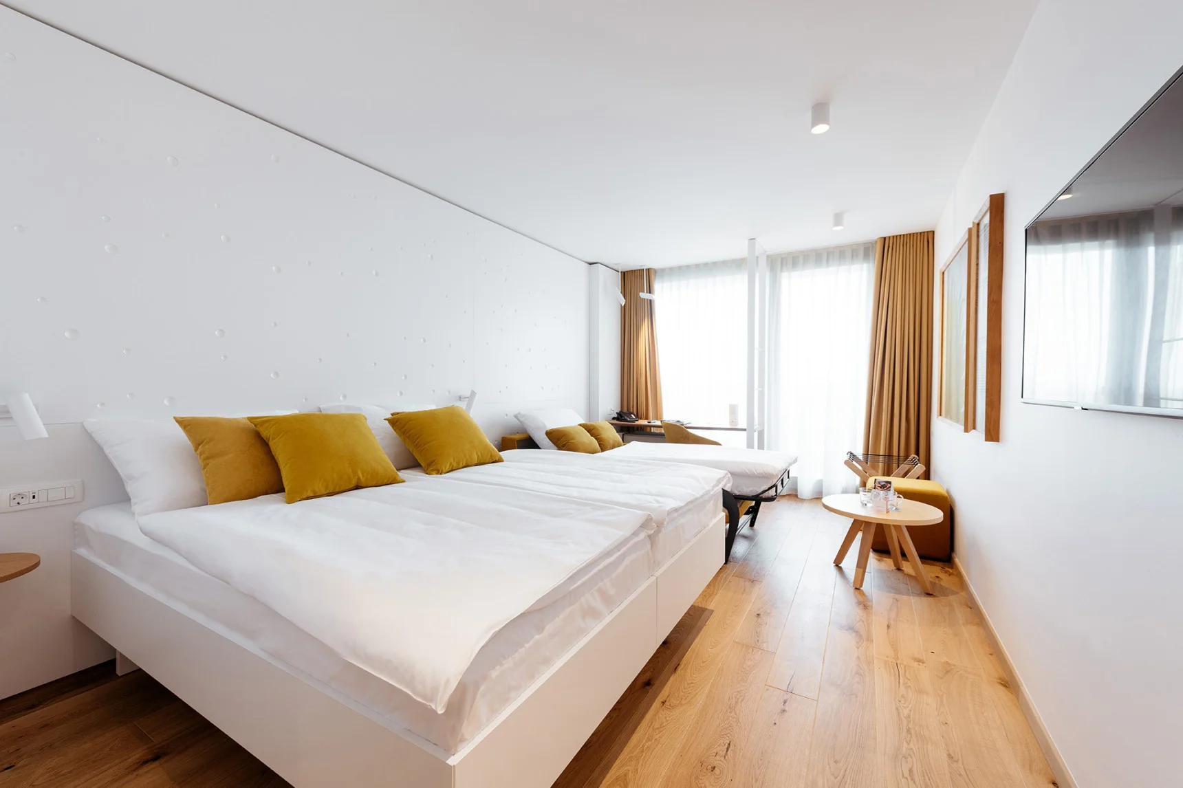 Udobna deluxe dvoposteljna soba z ležiščem širine 180 cm ali ločenima ležiščema širine 90 cm. V sobi veliki 23,5 m2 je kopalnica s kadjo in WC-jem, pisalna miza in enosed.